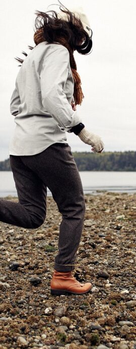 • A gray cat slinks past a wooden house. There’s something a little intimidating attempting to describe.
